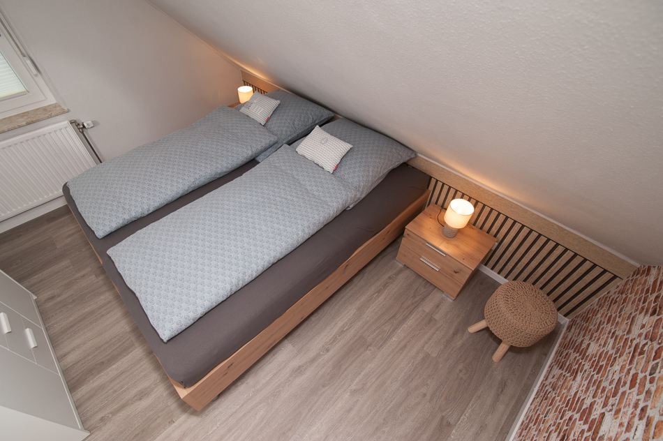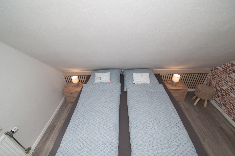 Sie besteht aus zwei Schlafzimmern, einem Wohn-Esszimmer, Küche, Duschbad. Das eine Schlafzimmer hat ein Doppelbett, das andere, kleinere Schlafzimmer ein Einzelbett.